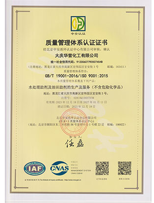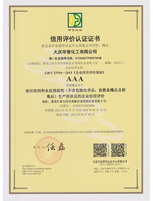 大慶華營化工有限公司成立于2006年7月10日,注冊資金3300萬元,公司類型為有限責任公司。位于大慶高新技術產業(yè)開發(fā)區(qū)宏偉園區(qū),是一家集油田助劑產品的研發(fā)、生產、銷售和技術服務為一體的現代化高新技術企業(yè)。公司注重科技創(chuàng)新,公司擁有18項自主知識產權。企業(yè)承擔過國家火炬計劃重點項目、國家科技型中小企業(yè)創(chuàng)新項目等,2011年被科技部火炬高新技術產業(yè)開發(fā)中心評為國家火炬計劃重點高新技術企業(yè)。公司十余種產品獲得中國石油天然氣集團公司產品質量認可證書,其中粘穩(wěn)型驅油劑獲國家火炬計劃重點項目證書。公司憑借多年對大慶油田及周邊油田地質情況的研究,可針對各油田地層特點調整產品的配方,更好地發(fā)揮各類油田助劑的性能。